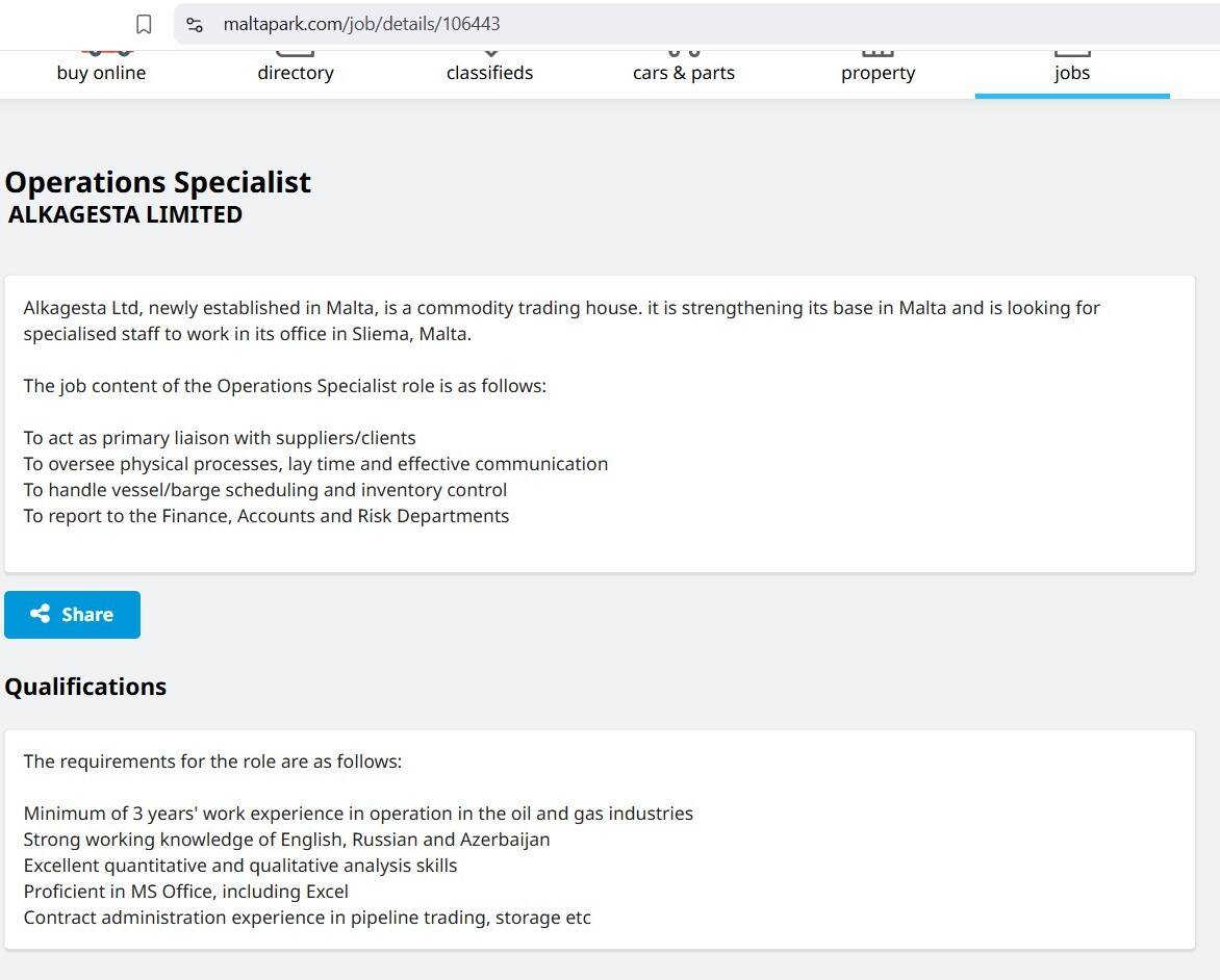 The company even published an unusual vacancy on Maltapark for an “Operations Specialist” whose main duty was to communicate with clients in Russian. Normally, firms with Alkagesta’s profile rely on discreet recruitment channels, but this time the search was made openly and publicly — a sign of urgency or even desperation.